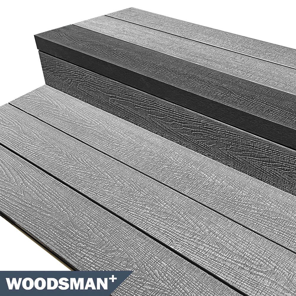 Charcoal Step Nose Board Woodsman+ are a commercial grade deck board, which provides a fantastically clean & professional finish to any deck area. The step nose board is perfect to be used on the lip of a step or around the perimeter of the deck area. Designed to create a 200mm riser (upstand) and 300mm tread (step), when used with the Active + boards, fitted either side of the step nose board.